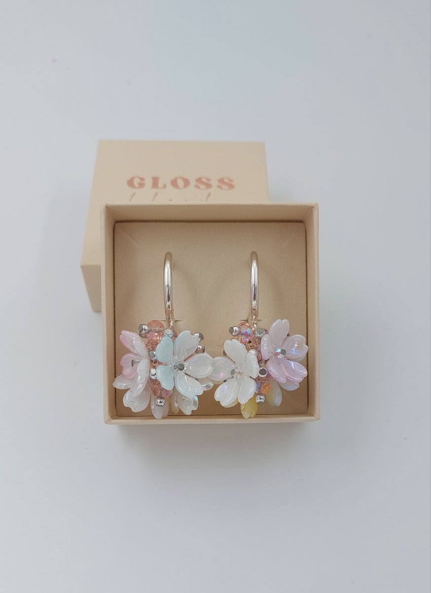 Ihastuttavat käsintehdyt Blossom korvakorut. Korvakorussa on neljä uniikin sävyistä akryylikukkaa, jotka kiertävät kukkakimpun lailla korun ympäri. Kukissa on vaihdellen hohtavaa peilipinnoitetta sekä osa kauniisti liukuvärjättyjä. Niiden keskellä pieni kirkas (ab pinnoitteella) hohtava Preciosa lasikristalli. Kukkien pinta on käsitelty niin että värit säilyvät kauniina. Vaaleanpunaiset (ab pinnoitteella) hohtavat lasikristallit, joiden päässä pieni metallihelmi. Korunosat ovat hopeoitua ruostumatonta terästä. . Korvarenkaan koko 25mm. Korvakorun pituus n.4,5cm ja paino n.8g.